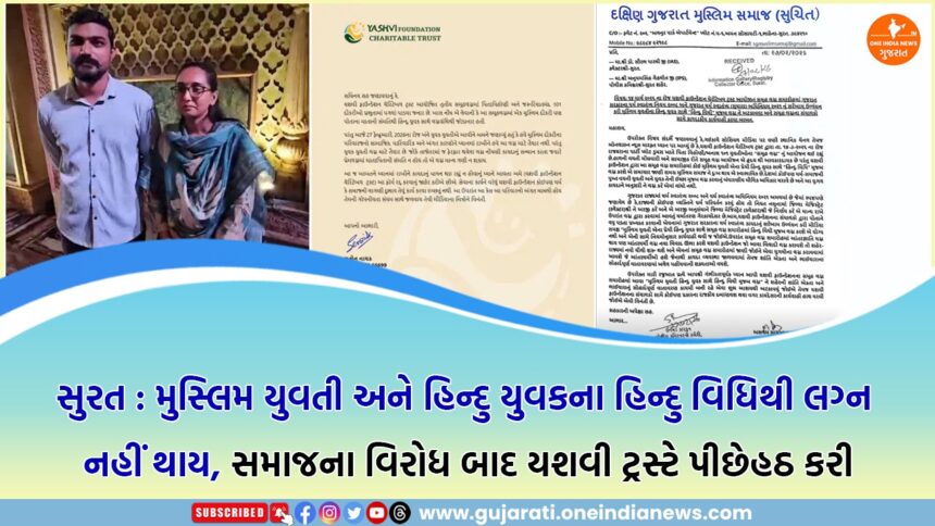 સુરત શહેરમાં 14 માર્ચે યોજાનાર ભવ્ય સમૂહલગ્ન સમારોહ વચ્ચે આંતરધર્મીય લગ્નને લઈને વિવાદ ઊભો થયો હતો. ‘યશવી ફાઉન્ડેશન ચેરિટેબલ ટ્રસ્ટ’ દ્વારા આયોજિત આ સમારોહમાં એક મુસ્લિમ યુવતી અને હિન્દુ યુવકના હિન્દુ વિધિથી લગ્ન કરાવવાની માહિતી બહાર આવતા દક્ષિણ ગુજરાત મુસ્લિમ સમાજ દ્વારા ભારે વિરોધ નોંધાવવામાં આવ્યો હતો. વિવાદ વધતા અને કાયદાકીય મુદ્દાઓ ઊભા થતાં આખરે ફાઉન્ડેશને આ લગ્ન રદ કરવાની જાહેરાત કરી છે.