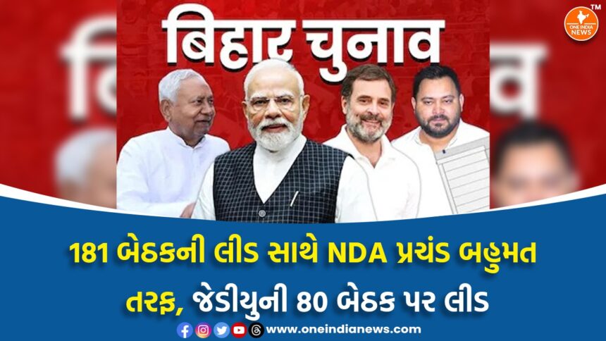ચૂંટણી પંચના સત્તાવાર આંકડા મુજબ NDAને 156 બેઠકો પર લીડ મળી રહી છે, જેમાં ભાજપ 61 અને JDU 63 બેઠક પર આગળ છે. RJD 34 અને કોંગ્રેસ 10 બેઠકો પર લીડ મેળવી રહ્યું છે. આગળના વલણોમાં JDUના પ્રદર્શનએ ખાસ નોંધપાત્ર રીતે ધ્યાન ખેંચ્યું છે. JDU 76 સુધીની લીડ સાથે NDAમાં સૌથી મોટી પાર્ટી રૂપે સામે આવી છે, જ્યારે BJP 69 બેઠકો પર છે. RJD 59થી વધુ લીડ મેળવી રહી છે અને કોંગ્રેસ 16 બેઠકો પર છે. VIP ત્રણ બેઠકો પર લીડમાં છે.