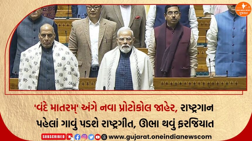 ભારત સરકાર દ્વારા રાષ્ટ્રીય ગીત ‘વંદે માતરમ્’ના સન્માન અને તેના ગાયન માટે નવી માર્ગદર્શિકા જાહેર કરવામાં આવી છે. નવા પ્રોટોકોલ મુજબ, હવે સત્તાવાર અને સરકારી કાર્યક્રમોમાં રાષ્ટ્રગાન ‘જન ગણ મન’ની સાથે વંદે માતરમ્ ગાવાના નિયમોમાં મહત્વપૂર્ણ ફેરફારો કરવામાં આવ્યા છે. સરકારનો ઉદ્દેશ રાષ્ટ્રીય ગીતને વધુ સન્માન આપવાનો અને જાહેર કાર્યક્રમોમાં એકરૂપતા જાળવવાનો છે.