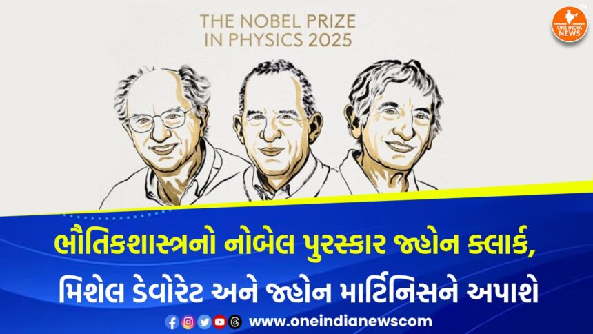 ભૌતિકશાસ્ત્રમાં 2025નો નોબેલ પુરસ્કાર જોન ક્લાર્ક, મિશેલ એચ ડેવોરેટ અને જ્હોન એમ માર્ટિનિસને આપવાની જાહેરાત કરાઈ છે. ઈલેક્ટ્રિક સર્કિટમાં મેક્રોસ્કોપિક ક્વોન્ટમ મિકેનિકલ ટનલિંગ અને એનર્જી ક્વોન્ટિસેશન શોધ બદલ તેમને નોબેલ પુરસ્કાર એનાયત કરાશે.