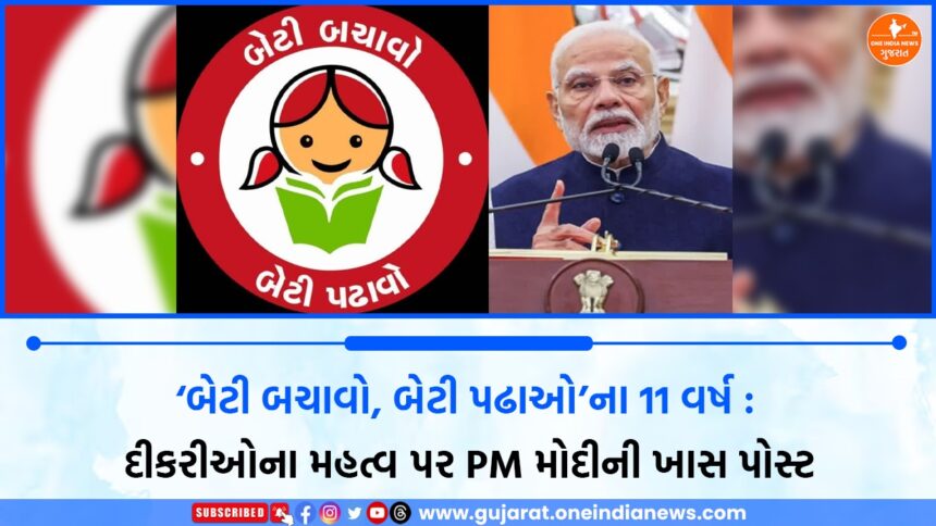 પ્રધાનમંત્રી નરેન્દ્ર મોદીએ ‘બેટી બચાવો, બેટી પઢાઓ’ અભિયાનના 11 વર્ષ પૂર્ણ થવાના અવસરે દીકરીઓના મહત્વને ઉજાગર કરતી એક ખાસ અને પ્રેરણાદાયી પોસ્ટ સોશિયલ મીડિયા પર શેર કરી છે. પીએમ મોદીએ પોતાના સંદેશમાં ભારતીય સંસ્કૃતિ અને પરંપરાનો ઉલ્લેખ કરતાં જણાવ્યું કે આપણા શાસ્ત્રોમાં દીકરીને ‘લક્ષ્મી’ સમાન માનવામાં આવી છે અને એક દીકરીનો સારો ઉછેર 10 દીકરાઓના ઉછેર જેટલો જ ગુણ અને મૂલ્ય આપે છે. તેમની આ વાત માત્ર એક વિચાર નહીં પરંતુ સમાજની માનસિકતા બદલવાનો મજબૂત સંદેશ છે, જે દીકરીઓ પ્રત્યે સન્માન, સમાનતા અને સશક્તિકરણની ભાવનાને વધુ મજબૂત કરે છે.