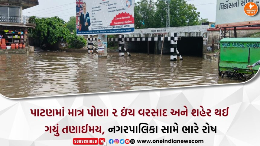 પાટણ શહેરમાં આજે સવારે પડેલા માત્ર પોણા ૨ ઇંચ જેટલા વરસાદે શહેરના વ્યવસ્થાપનનાં ભંડાફોડ કરી નાખ્યા. શહેરનું હાર્દ માનાતું આનંદ સરોવર વિસ્તારમાંથી લઈ પાટણ રેલવે ઘરનાળા તરફ જતો માર્ગ, પાણીથી ફૂલ ભરાઈ જતા સંપૂર્ણ બંધ થયો હતો.