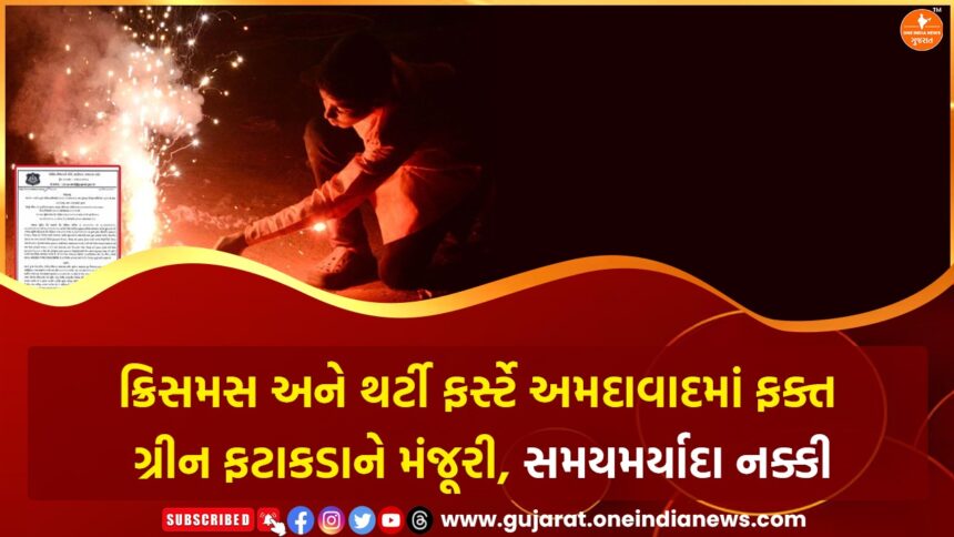 આ આદેશ મુજબ અમદાવાદ શહેરમાં માત્ર PESO દ્વારા માન્યતા પ્રાપ્ત ‘ગ્રીન ફટાકડા’ના ઉપયોગને જ મંજૂરી આપવામાં આવી છે. નવા નિયમો અનુસાર નાતાલ અને નવા વર્ષની પૂર્વ રાત્રે રાત્રે 11.55 વાગ્યાથી 12.30 વાગ્યા સુધી, એટલે કે માત્ર 35 મિનિટ માટે જ ફટાકડા ફોડવાની છૂટ રહેશે. શહેરમાં ફક્ત લાયસન્સ ધરાવતા વેપારીઓ જ ગ્રીન ફટાકડા વેચી શકશે, જ્યારે ઓનલાઈન વેચાણ અને વિદેશી ફટાકડાના વેપાર પર સંપૂર્ણ પ્રતિબંધ મૂકવામાં આવ્યો છે.
