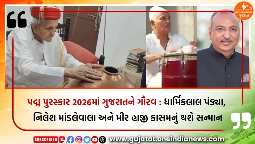 આ યાદીમાં ગુજરાતના ત્રણ પ્રતિભાશાળી નાગરિકો પણ સ્થાન મેળવ્યા છે. જૂનાગઢના મીર હાજી કાસમ, જેમને લોકકલાના ક્ષેત્રમાં હાજી રમકડું અને ઢોલક વગાડવાની કુશળતા માટે ઓળખવામાં આવે છે, કળા ક્ષેત્રમાં પદ્મ પુરસ્કારથી સન્માનિત થવાના છે. વડોદરાના ધાર્મિકલાલ પંડ્યા, જેઓ માનભટ્ટ પરંપરાને જાળવતા અને આગળ વધારતા મહાન કળાકાર છે, તેમને પણ કળા ક્ષેત્રમાં આ માન આપવામાં આવશે. જ્યારે સુરતના નિલેશ માંડલેવાલા, જેઓ અંગદાન અને સામાજિક સેવા ક્ષેત્રમાં તેમની અવિસ્મરણીય સેવા માટે જાણીતાં છે, તેમને સામાજિક કાર્ય ક્ષેત્રમાં પદ્મ પુરસ્કાર આપવામાં આવશે. આ ત્રણ ગુજરાતીઓની પસંદગી રાજ્યના ગૌરવ અને દેશભક્તિની ચિહ્નરૂપ બની છે, જે વિવિધ ક્ષેત્રોમાં આપેલા અસાધારણ યોગદાનને શ્રેષ્ઠતા સાથે માન્યતા આપે છે.
