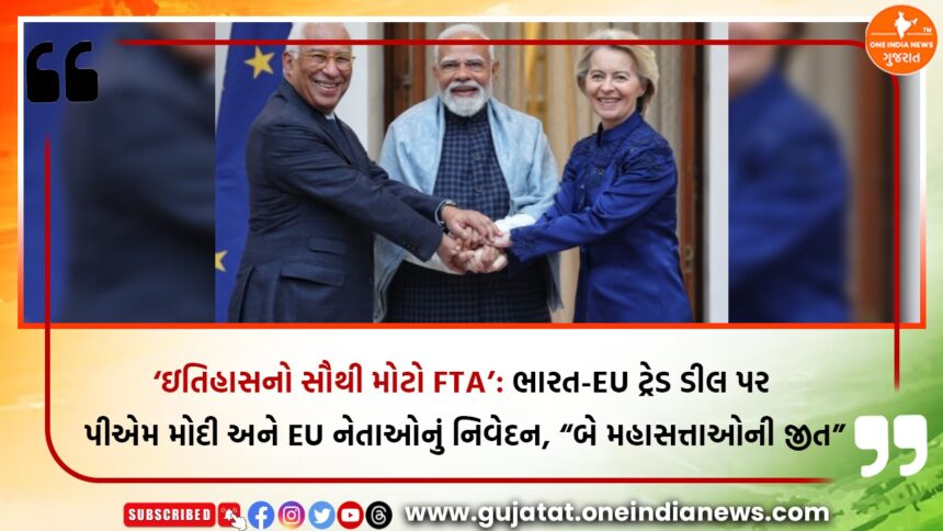 ભારત અને યુરોપિયન યુનિયન વચ્ચે 18 વર્ષથી ચાલી રહેલી લાંબી અને જટિલ વાટાઘાટો પછી અંતે મંગળવાર, 27 જાન્યુઆરીના રોજ ઐતિહાસિક ફ્રી ટ્રેડ એગ્રીમેન્ટ (FTA)ની સત્તાવાર જાહેરાત કરવામાં આવી છે. 16મી ભારત-EU સમિટ દરમિયાન આ મહત્વપૂર્ણ કરાર અંગે સહમતિ જાહેર કરવામાં આવી હતી, જેને બાદમાં વડાપ્રધાન નરેન્દ્ર મોદીએ પણ પુષ્ટિ આપી હતી. ત્યારબાદ યોજાયેલી સંયુક્ત પ્રેસ કૉન્ફરન્સમાં પીએમ મોદી, યુરોપિયન કમિશનના પ્રમુખ ઉર્સુલા વોન ડેર લેયેન અને યુરોપિયન કાઉન્સિલના અધ્યક્ષ એન્ટોનિયો લુઈસ સાન્તોસ દા કોસ્ટાએ કરાર અંગે વિગતવાર માહિતી આપી અને તેને ઐતિહાસિક ક્ષણ ગણાવી. આ પ્રસંગે બંને પક્ષોએ મુક્ત વેપાર કરારની નકલ એકબીજાને સોંપી હતી.