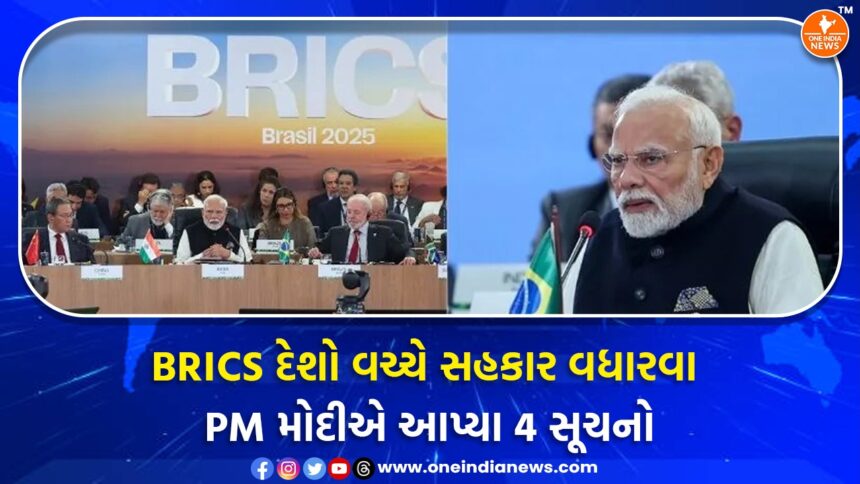 સોમાવારે (7 જુલાઈ) બ્રાઝિલ ખાતે યોજાયેલ 17માં બ્રિક્સ (BRICS) શિખર સંમેલનમાં વડાપ્રધાન મોદીએ સત્રને સંબોધિત કર્યું હતું. જેમાં બ્રિક્સ દેશો વચ્ચે સહકાર વધે એ માટે PM મોદીએ સમિટને ખાસ સૂચનો કર્યા હતા. PM મોદીએ તેમના ઓફિશીયલ X એકાઉન્ટ પર સમિટ સંમેલનના ફોટો શેર કરી માહિતી આપી હતી.