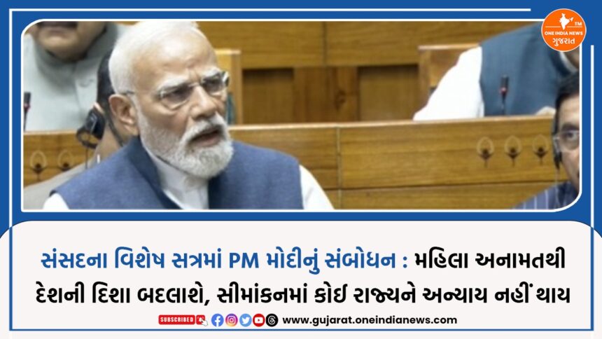One India News > News > Gujarat > સંસદના વિશેષ સત્રમાં PM મોદીનું સંબોધન : મહિલા અનામતથી દેશની દિશા બદલાશે, સીમાંકનમાં કોઈ રાજ્યને અન્યાય નહીં થાય