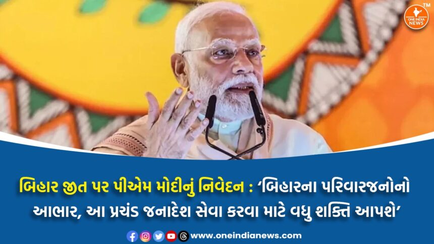 બિહાર વિધાનસભા ચૂંટણી 2025માં NDAની પ્રચંડ અને ઐતિહાસિક જીત બાદ વડા પ્રધાન નરેન્દ્ર મોદીએ હૃદયપૂર્વકની પ્રતિક્રિયા આપી મતદારોનાં આભાર માન્યા. તેમણે કહ્યું કે આ જીત માત્ર રાજકીય વિજય નથી, પરંતુ સુશાસન, વિકાસ, જનકલ્યાણ, સામાજિક ન્યાય અને સ્થિરતામાં લોકોના વિશ્વાસનું પ્રમાણપત્ર છે. પીએમ મોદીએ બિહારને “મારા પરિવારજનો” કહી સંબોધ્યો અને જણાવ્યું કે, “આ પ્રચંડ જનાદેશ અમને જનતા-જનાર્દનની વધુ તનમનથી સેવા કરવાની અને બિહારના વિકાસ માટે નવા ઉત્સાહ સાથે કાર્ય કરવાની શક્તિ આપે છે.”