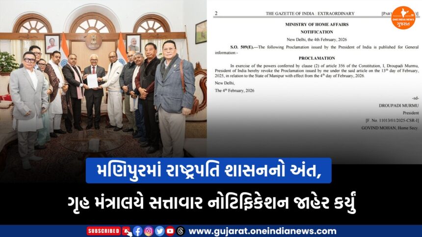 મણિપુરમાં લાંબા સમયથી લાગુ રહેલું રાષ્ટ્રપતિ શાસન અંતે હટાવી લેવામાં આવ્યું છે. ગૃહ મંત્રાલયે મંગળવારે (4 ફેબ્રુઆરી) સત્તાવાર નોટિફિકેશન જાહેર કરીને આ નિર્ણયની જાહેરાત કરી હતી. નોટિફિકેશન અનુસાર, આ નિર્ણય 4 ફેબ્રુઆરી 2026થી અમલમાં આવશે. આ સાથે જ મણિપુરમાં કેન્દ્રીય શાસનનો અંત આવ્યો છે અને રાજ્યમાં ફરીથી લોકશાહી સરકાર રચવાનો માર્ગ ખુલ્યો છે.