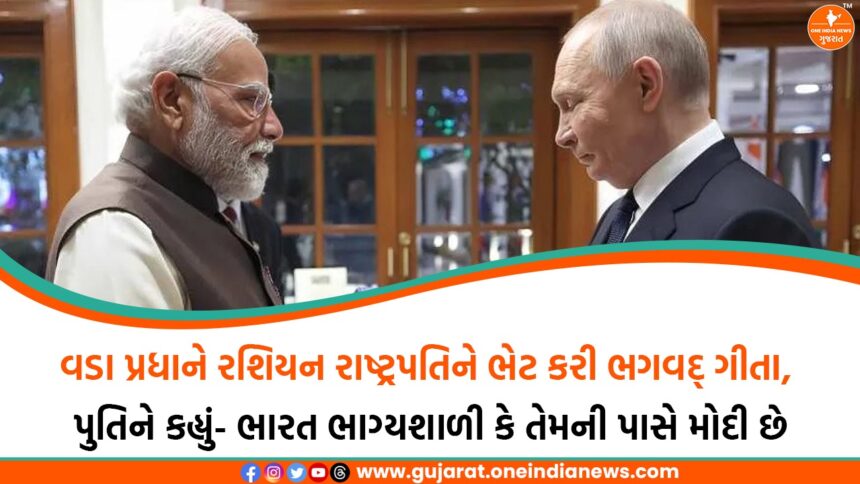 प्रधानमंत्री नरेंद्र मोदी ने रूस के राष्ट्रपति पुतिन को रूसी भाषा में गीता की एक कॉपी भेंट की। गीता की शिक्षाएं दुनिया भर में लाखों लोगों को प्रेरणा देती हैं।