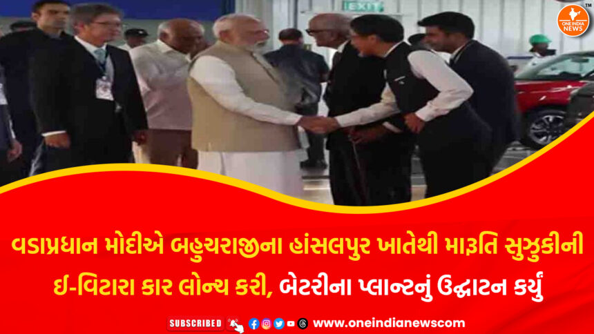 વડાપ્રધાન મોદીના ગુજરાત પ્રવાસનો આજે બીજો દિવસ છે. તેઓ ગાંધીનગર રાજભવનથી બહુચરાજી પાસેના હાંસલપુર ખાતે પહોંચ્યા છે. સુઝુકી કંપનીની પહેલી ઈલેક્ટ્રિક કાર ‘Maruti e Vitara’કારને લોન્ચ કરી હતી અને બેટરી પ્લાન્ટનું ઉદ્ઘાટન કર્યું છે. જે ઓટોમોબાઈલ હબમાં ગુજરાતનું સૌથી મોટું પગલું માનવામાં આવે છે. આ ઇલેક્ટ્રિક વ્હીકલ 100 દેશોમાં એક્સપોર્ટ પણ થશે. સુઝુકી કંપનીના ટોચના અધિકારીઓ સાથે મુલાકાત કરી