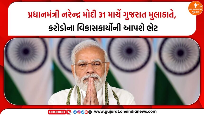 પ્રધાનમંત્રી નરેન્દ્ર મોદી આગામી 31 માર્ચ, 2026ના રોજ ગુજરાતની મુલાકાતે આવી રહ્યા છે. આ મુલાકાત દરમિયાન તેઓ રાજ્યના શહેરી વિસ્તારોમાં જનસુખાકારી વધારતા અનેક મહત્વપૂર્ણ વિકાસલક્ષી પ્રકલ્પોનું લોકાર્પણ અને ખાતમુહૂર્ત કરશે. આ મુલાકાત રાજ્યના શહેરી વિકાસ માટે મહત્વપૂર્ણ માનવામાં આવી રહી છે.