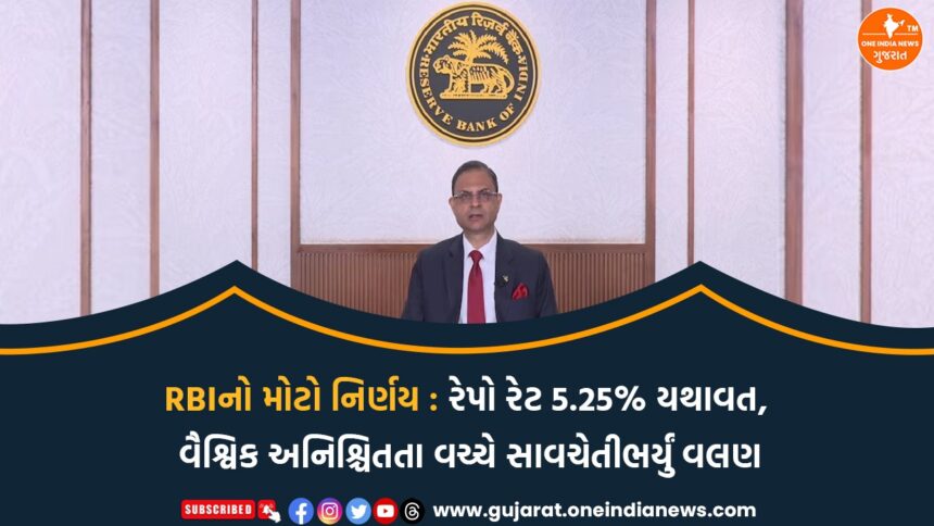 ભારતીય અર્થતંત્રને ધ્યાનમાં રાખીને Reserve Bank of Indiaએ મહત્વપૂર્ણ નિર્ણય લીધો છે. RBIના ગવર્નર સંજય મલ્હોત્રાએ જાહેરાત કરી છે કે આ વખતે પણ રેપો રેટમાં કોઈ ફેરફાર કરવામાં આવ્યો નથી અને તેને 5.25% પર યથાવત રાખવામાં આવ્યો છે. અમેરિકા અને Iran વચ્ચેના સંઘર્ષને કારણે ઊભી થયેલી વૈશ્વિક અનિશ્ચિતતાને ધ્યાનમાં રાખીને આ નિર્ણય સર્વસંમતિથી લેવામાં આવ્યો છે.