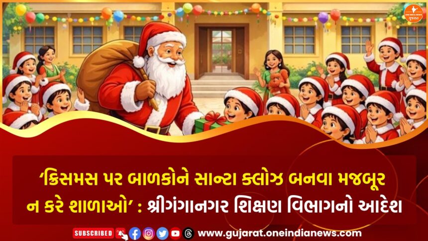 ક્રિસમસ તહેવારની ઉજવણીને લઈને રાજસ્થાનના શ્રીગંગાનગર જિલ્લામાં શિક્ષણ વિભાગે મહત્વપૂર્ણ પરિપત્ર જાહેર કર્યો છે. એડિશનલ ડિસ્ટ્રિક્ટ એજ્યુકેશન ઑફિસર (ADEO) દ્વારા 22 ડિસેમ્બરે જારી કરાયેલા આ પરિપત્રમાં તમામ ખાનગી શાળાઓને સ્પષ્ટ સૂચના આપવામાં આવી છે કે વિદ્યાર્થીઓને સાન્ટા ક્લોઝ બનવા અથવા ક્રિસમસ સંબંધિત પ્રવૃત્તિઓમાં ભાગ લેવા માટે કોઈપણ પ્રકારનું દબાણ ન કરવામાં આવે. પરિપત્રમાં જણાવાયું છે કે જો વાલી અને વિદ્યાર્થીની સ્વેચ્છા અને સહમતિ હોય તો આવી પ્રવૃત્તિઓ યોજવામાં શિક્ષણ વિભાગને કોઈ વાંધો નથી, પરંતુ બળજબરી કે માનસિક દબાણની ફરિયાદ મળી આવશે તો શાળા સંચાલન સામે કડક કાર્યવાહી કરવામાં આવશે.