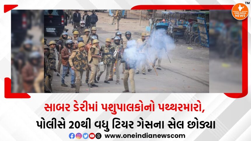 One India News > News > Gujarat > સાબર ડેરીમાં પશુપાલકોનો પથ્થરમારો, પોલીસે 20થી વધુ ટિયર ગેસના સેલ છોડ્યા