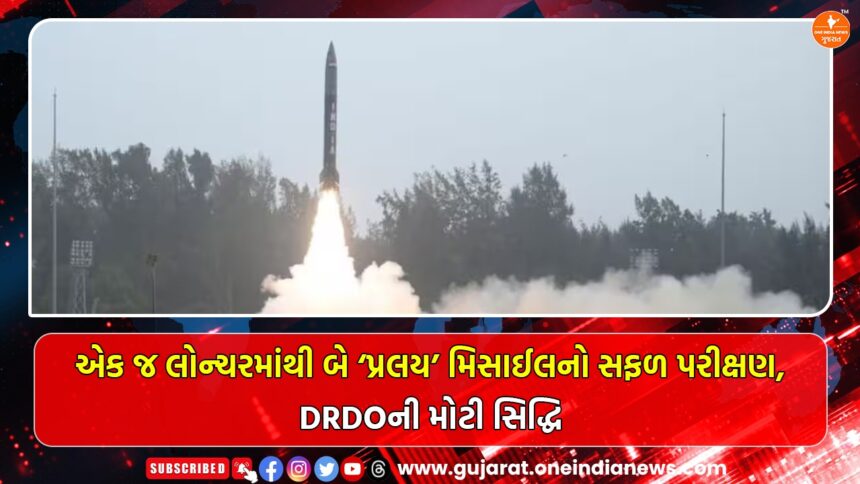 DRDOએ ઓડિશાના દરિયાકાંઠે આવેલી ચાંદીપુર ઇન્ટિગ્રેટેડ ટેસ્ટ રેન્જ પરથી આજે એક ઐતિહાસિક અને મહત્વપૂર્ણ સફળ પરીક્ષણ કર્યું છે. સવારે અંદાજે 10.30 વાગ્યે એક જ લોન્ચરથી ખૂબ જ ઓછા સમયાંતરે સતત બે ‘પ્રલય’ ક્વાસી-બેલિસ્ટિક મિસાઈલ લોન્ચ કરવામાં આવી, જે યુઝર ટ્રાયલનો ભાગ હતો. બંને મિસાઈલોએ નિર્ધારિત ટ્રેજેક્ટરી અનુસાર ઉડાન ભરી અને તમામ પરીક્ષણ લક્ષ્યોને સફળતાપૂર્વક પૂર્ણ કર્યા. ચાંદીપુર રેન્જમાં લગાવવામાં આવેલા અદ્યતન ટ્રેકિંગ સેન્સરો તેમજ દરિયામાં તૈનાત જહાજ પર સ્થાપિત ટેલિમેટ્રી સિસ્ટમ દ્વારા મિસાઈલના પ્રદર્શનની સંપૂર્ણ પુષ્ટિ કરવામાં આવી છે.