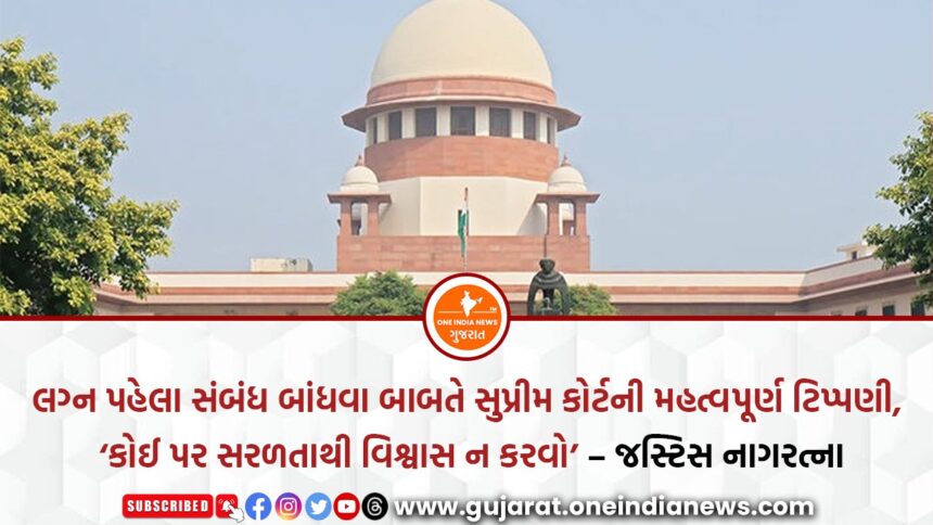 લગ્નની લાલચ આપી શારીરિક સંબંધ બાંધવાના કેસમાં સુપ્રીમ કોર્ટ દ્વારા કરવામાં આવેલી ટિપ્પણી હાલ ચર્ચાનો વિષય બની છે. સુપ્રીમ કોર્ટની ન્યાયમૂર્તિ બી.વી. નાગરત્નાની અધ્યક્ષતાવાળી બેંચે કહ્યું કે લગ્ન પહેલા શારીરિક સંબંધ બાંધતા પહેલા યુવતીઓએ ખાસ સાવધાની રાખવી જોઈએ.