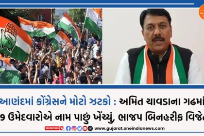 આણંદમાં કોંગ્રેસને મોટો ઝટકો : અમિત ચાવડાના ગઢમાં 39 ઉમેદવારોએ નામ પાછું ખેંચ્યું, ભાજપ બિનહરીફ વિજેતા