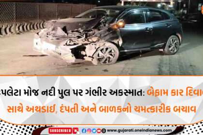 ઉપલેટા મોજ નદી પુલ પર ગંભીર અકસ્માત: બેફામ કાર દિવાલ સાથે અથડાઈ, દંપતી અને બાળકનો ચમત્કારીક બચાવ
