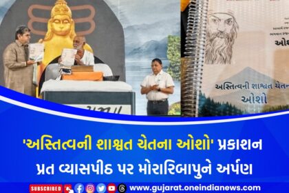 ‘અસ્તિત્વની શાશ્વત ચેતના ઓશો’ પ્રકાશન પ્રત વ્યાસપીઠ પર મોરારિબાપુને અર્પણ