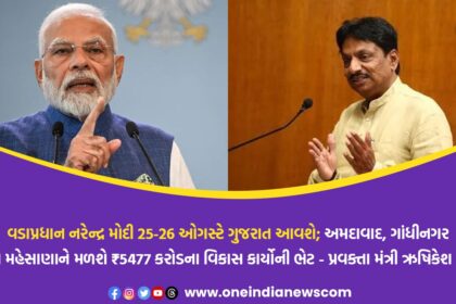 વડાપ્રધાન નરેન્દ્ર મોદી 25-26 ઓગસ્ટે ગુજરાત આવશે; અમદાવાદ, ગાંધીનગર અને મહેસાણાને મળશે ₹5477 કરોડના વિકાસ કાર્યોની ભેટ – પ્રવક્તા મંત્રી ઋષિકેશ પટેલ