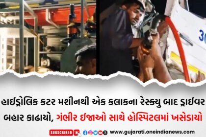 હાઈડ્રોલિક કટર મશીનથી એક કલાકના રેસ્ક્યુ બાદ ડ્રાઈવર બહાર કાઢાયો, ગંભીર ઈજાઓ સાથે હોસ્પિટલમાં ખસેડાયો