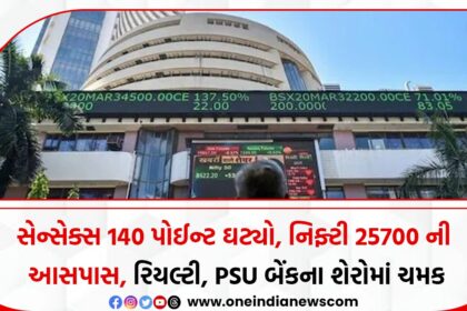 સેન્સેક્સ 140 પોઈન્ટ ઘટ્યો, નિફ્ટી 25700 ની આસપાસ, રિયલ્ટી, PSU બેંકના શેરોમાં ચમક