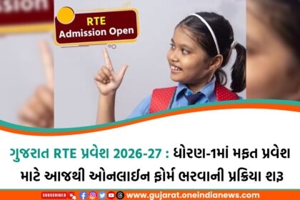 ગુજરાત RTE પ્રવેશ 2026-27 : ધોરણ-1માં મફત પ્રવેશ માટે આજથી ઓનલાઈન ફોર્મ ભરવાની પ્રક્રિયા શરૂ
