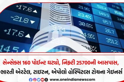 સેન્સેક્સ 160 પોઈન્ટ ઘટ્યો, નિફ્ટી 25700ની આસપાસ, ભારતી એરટેલ, ટાઇટન, એપોલો હોસ્પિટલ્સ ટોચના ગેઇનર્સ