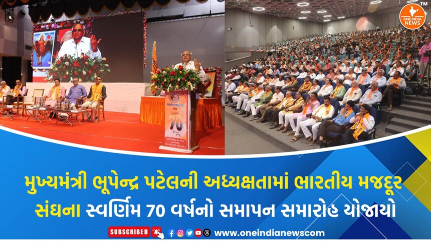મુખ્યમંત્રી ભૂપેન્દ્ર પટેલની અધ્યક્ષતામાં ગાંધીનગર ખાતે ભારતીય મજદૂર સંઘના સ્વર્ણિમ 70 વર્ષની ઉજવણીનો સમાપન સમારોહ શ્રમ અને રોજગાર મંત્રી બળવંતસિંહ રાજપૂતની પ્રેરક ઉપસ્થિતિ યોજાયો હતો.