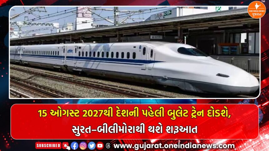 કેન્દ્રીય રેલ્વે મંત્રી અશ્વિની વૈષ્ણવે જાહેરાત કરી છે કે ભારતની પ્રથમ બુલેટ ટ્રેન 15 ઓગસ્ટ 2027ના રોજ દોડશે. આ ઐતિહાસિક શરૂઆત સુરતથી બીલીમોરા (નવસારી) વચ્ચેના રૂટ પરથી થશે. બુલેટ ટ્રેન પ્રોજેક્ટને કુલ પાંચ તબક્કામાં શરૂ કરવાની યોજના છે. પ્રથમ તબક્કામાં સુરત–બીલીમોરા વચ્ચે સેવા શરૂ થશે, ત્યારબાદ બીજા તબક્કામાં વાપી–સુરત, ત્રીજા તબક્કામાં વાપી–અમદાવાદ, ચોથા તબક્કામાં થાણે–અમદાવાદ અને અંતિમ તબક્કામાં સંપૂર્ણ મુંબઈ–અમદાવાદ રૂટ પર બુલેટ ટ્રેન શરૂ કરવામાં આવશે.