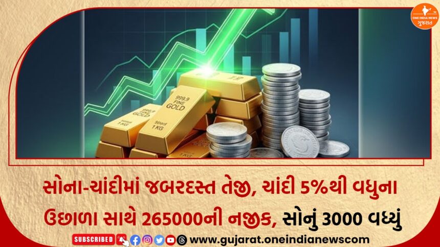 ચાંદીના ભાવમાં આજે ભારે તેજી જોવા મળી હતી. અગાઉના બંધ ભાવ ₹2,49,892.00ની સરખામણીએ ચાંદી ₹2,59,887.00 પર ખુલ્યું અને ઝડપથી વધીને ₹2,64,885.00 સુધી પહોંચી ગયું. ચાંદીમાં એક જ દિવસમાં અંદાજે ₹14,005 (+5.60%)નો મોટો ઉછાળો નોંધાયો છે, જે રોકાણકારો માટે મહત્વપૂર્ણ ગણાય છે. ઉદ્યોગીય માંગ અને વૈશ્વિક બજારમાં કિંમતી ધાતુઓ તરફ વધતી રસદારીએ ચાંદીના ભાવને વધુ મજબૂત બનાવ્યા છે.