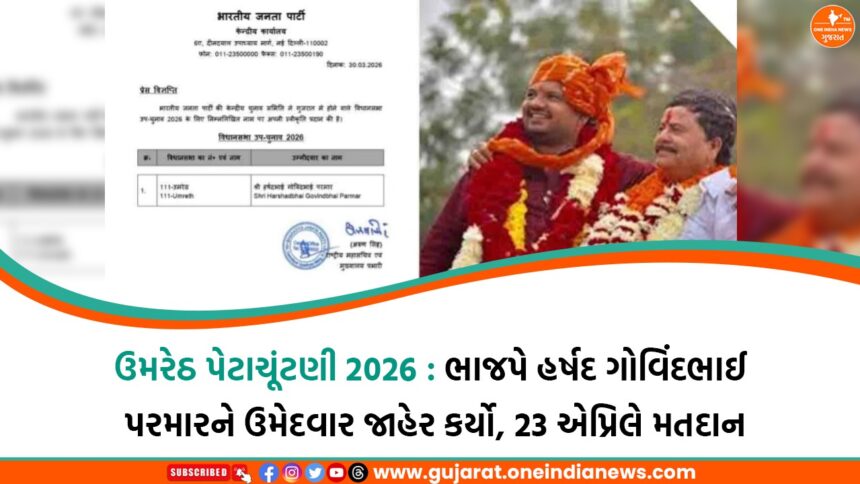 One India News > News > Anand > ઉમરેઠ પેટાચૂંટણી 2026: ભાજપે હર્ષદ ગોવિંદભાઈ પરમારને ઉમેદવાર જાહેર કર્યો, 23 એપ્રિલે મતદાન