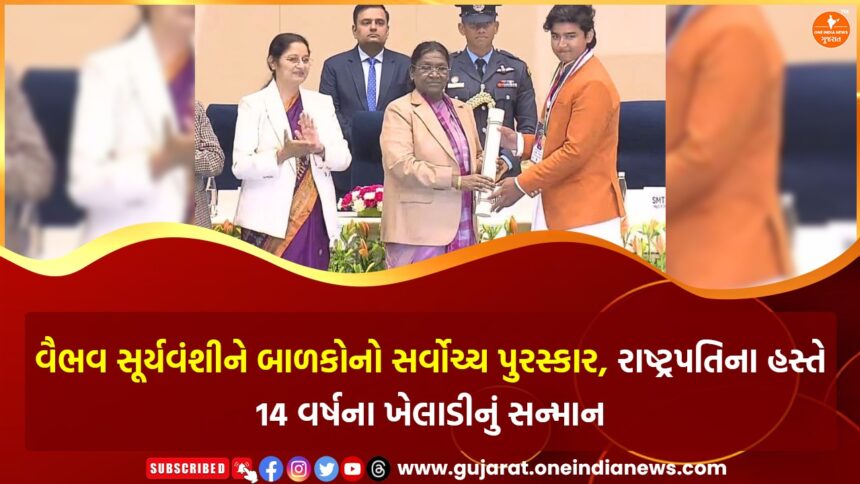 ભારતના યુવા ક્રિકેટર વૈભવ સૂર્યવંશીએ નાની ઉંમરે જ અસાધારણ પ્રતિભા દર્શાવી દેશભરમાં પોતાની ખાસ ઓળખ બનાવી છે. માત્ર 14 વર્ષની ઉંમરે ક્રિકેટ જગતમાં ખળભળાટ મચાવનાર વૈભવને ભારત સરકાર દ્વારા આપવામાં આવતા દેશના સર્વોચ્ચ બાળ સન્માન ‘પ્રધાનમંત્રી રાષ્ટ્રીય બાળ પુરસ્કાર’થી નવાજવામાં આવ્યો છે. શુક્રવારે નવી દિલ્હીના વિજ્ઞાન ભવન ખાતે યોજાયેલા ભવ્ય સમારોહમાં રાષ્ટ્રપતિ દ્રૌપદી મુર્મૂએ બિહારના આ હોનહાર બેટરને પોતાના હસ્તે એવોર્ડ એનાયત કરી તેના રમતગમત ક્ષેત્રે આપેલા નોંધપાત્ર યોગદાનને માન્યતા આપી હતી.