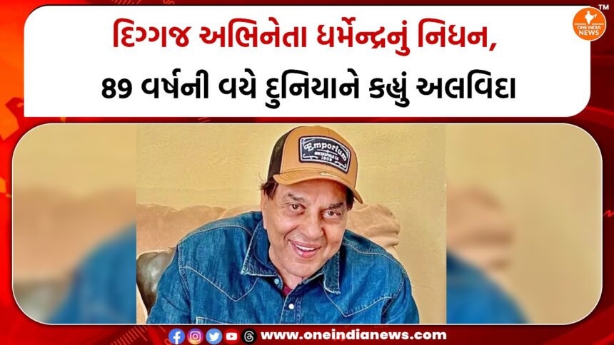 સમાચાર એજન્સી IANS અનુસાર પીઢ અભિનેતા ધર્મેન્દ્રનું આજે 89 વર્ષની વયે નિધન થયું છે. તેઓ બોલિવૂડમાં હી-મેનના નામથી પ્રખ્યાત હતા. તેમના નિધનથી સિનેમા જગતમાં શોકની લહેર પ્રસરી છે. તેઓ લાંબા સમયથી બીમાર હતા અને મુંબઈની બ્રીચ કેન્ડી હોસ્પિટલમાં દાખલ હતા. હાલમાં જ તેમને હોસ્પિટલમાંથી રજા આપવામાં આવી હતી અને ઘરે જ તેમની સારવાર ચાલી રહી હતી.