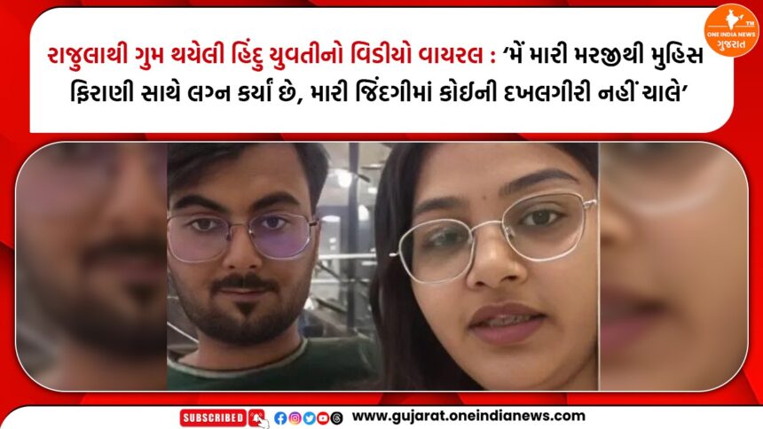 અમરેલી જિલ્લાના રાજુલા શહેરમાં ગુમ થયેલી યુવતીના મામલે હવે મહત્વપૂર્ણ વળાંક આવ્યો છે. સોશિયલ મીડિયા પર વાયરલ થયેલા એક વિડીયોમાં યુવતીએ પોતે જ જાહેર કર્યું છે કે તેણે પોતાની મરજીથી લગ્ન કર્યા છે અને તે સંપૂર્ણપણે સુરક્ષિત છે. આ ઘટનાએ સ્થાનિક સ્તરે ચર્ચા અને વિવાદને વધુ ઉગ્ર બનાવ્યો છે.