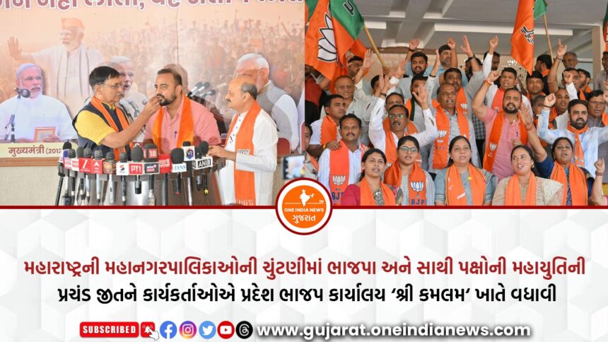 ગુજરાત પ્રદેશ ભાજપા મીડિયા વિભાગની અખબારી યાદી જણાવે છે કે, આજે મહારાષ્ટ્રની મહાનગરપાલિકાઓની ચૂંટણીમાં ભાજપા અને સાથી પક્ષોની મહાયુતિને પ્રચંડ બહુમતિ સાથે જનતાએ આશીર્વાદ આપ્યા છે ત્યારે ગુજરાત પ્રદેશ ભારતીય જનતા પાર્ટીના પ્રદેશ કાર્યાલય ‘શ્રી કમલમ‘ ખાતે પ્રદેશ મહામંત્રી અજયભાઈ બ્રહ્મભટ્ટની ઉપસ્થિતિમાં ભાજપા અગ્રણીઓ અને કાર્યકરોએ ‘ભારતમાતા કી જય‘ ના પ્રચંડ જયનાદ સાથે ફટાકડા ફોડી તેમજ મોં મીઠું કરી મહાયુતિની ભવ્ય જીતની ઉજવણી કરી હતી.